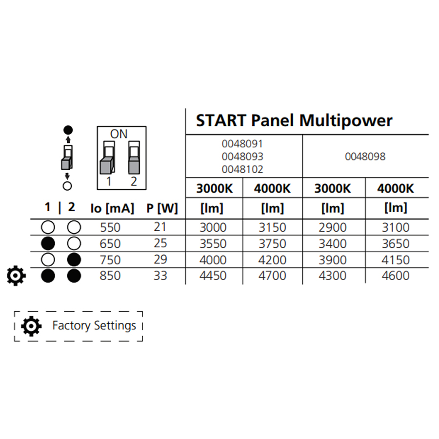 Start Panel -valaisinsarja on valotehokas ratkaisu yleis- ja toimistovalaistukseen: aulat, käytävät ja oleskelutilat. Valaisimessa on opaali-, tai UGR19 häikäisyarvon täyttävä mikroprismahäikäisysuoja. Start Panel on uppoasennettava moduulivalasin, joka sopii myös pinta- ja ripustusasennukseen erikseen tilattavilla lisätarvikkeilla. Multipower-mallissa DIP-kytkimellä voidaan säätää useita valovirta tasoja neljässä vaiheessa. Värilämpötila valittavissa 3000/4000K.